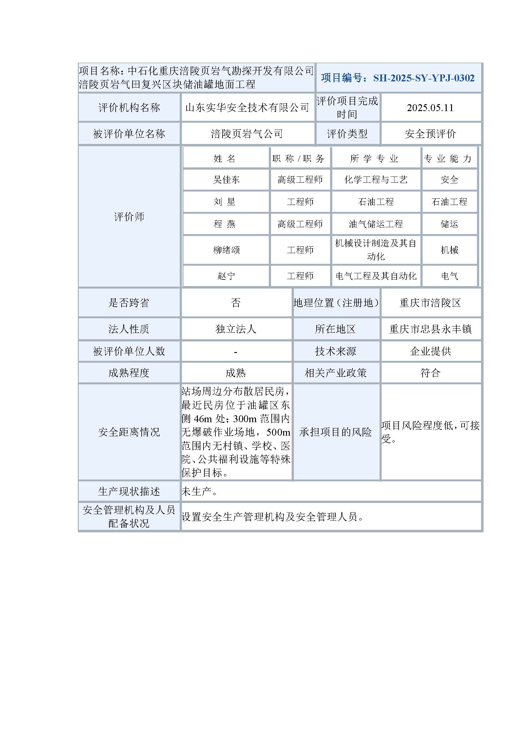 中石化重慶涪陵頁巖氣勘探開發有限公司涪陵頁巖氣田復興區塊儲油罐地面工程安全預評價