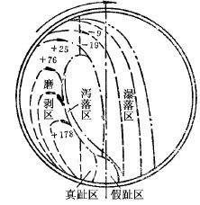 如圖所示,新給礦中的小粒,由給料端進(jìn)入,沿A面均勻地落于筒體底部中心,然后向兩側(cè)擴(kuò)散。大塊具有較大的動能,總是趨向較遠(yuǎn)的一側(cè),但其中有一部分必然要和AB面相碰,然后向另一側(cè)返回,因之,也使大塊得到均勻分布。A——A、B——B 在這里的作用是防止給入物料有害的偏析。自排礦端沿下面返回的顆粒如同新給料中的細(xì)粒一樣,均勻地落于筒體底部的中,然后向兩邊擴(kuò)散。大塊和細(xì)粒在筒體底部沿軸向運(yùn)動,方向正好相反,于是產(chǎn)生磨剝作用。