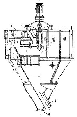 通過式離心分級器(見圖3),主要用于與干式磨機閉路工作。設備主要由外錐1和內錐2組成,上部裝有導向葉片5,使由內外錐之間上來的氣流呈切線進入內錐。磨機產(chǎn)物與氣流一起從底部管道中以大約18~20米/秒的速度向上供入,進入內外錐之間的環(huán)形空間后,因過流斷面變大,速度降至4~6米/秒,于是,粗的礦粒落下,由管4中排出,返回磨機再磨。其他礦粒被氣流帶著往上行,經(jīng)葉片5,呈切線進入內錐,產(chǎn)生回旋運動。在慣性離心力作用下,較粗的礦粒被拋到內錐壁上,然后下落,由排礦管6排出。這種產(chǎn)物或作為產(chǎn)品,或者返回磨機,視情況而定。細礦粒隨氣流從頂部管道中排出,至集塵器中收集,為細粒產(chǎn)物。