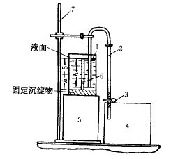 淘析法水析裝置也稱薩巴寧沉降分析儀,如圖3-4-12所示。淘析過程是在一個直徑為70~100mm、高度為150~170mm的玻璃杯1中進行的。杯內裝有一根直徑約為6~10mm的虹吸管2。虹吸管的短管部分應插入杯內,使其管口下端距固體沉淀物料面留有5mm的距離。虹吸管另一端帶有管夾3,插入到溢流收集槽4內。