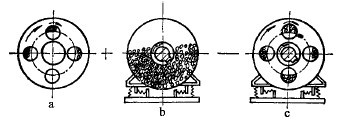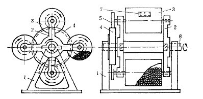 圖2示出了回轉(zhuǎn)磨機(jī)的結(jié)構(gòu)及工作原理。當(dāng)轉(zhuǎn)動(dòng)軸6旋轉(zhuǎn)時(shí),筒體1除在水平方面旋轉(zhuǎn)外還圍繞2在垂直方向旋轉(zhuǎn),這樣促使研磨介質(zhì)作非常復(fù)雜的運(yùn)動(dòng)。筒體在垂直方向和水平方向適宜的速比為1:1~1:1.5。
