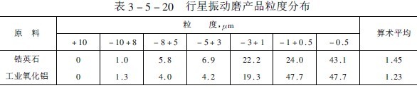 的轉(zhuǎn)動(dòng)形成了筒繞Ⅰ號軸的公轉(zhuǎn);Ⅱ號輪帶動(dòng)Ⅵ號輪形成磨筒繞其自身軸的自轉(zhuǎn)。這種磨機(jī)兼有行星磨和振動(dòng)磨二者的特點(diǎn),具有高頻沖擊和磨剝的雙重作用,故磨碎作用強(qiáng),是一種有效的超細(xì)磨碎設(shè)備。表3-5-20示出了用該磨機(jī)磨碎鋯英石和工業(yè)氧化鋁的產(chǎn)品粒度分布。