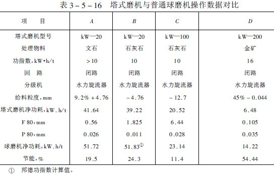 表3-5-16示出了美國(guó)科珀(Kopper)公司的某一子公司提供的塔式磨機(jī)與球磨機(jī)的工作性能對(duì)比結(jié)果,表中,例A、B是實(shí)驗(yàn)室試驗(yàn)結(jié)果;C是南方麥奇根煙氣脫硫系統(tǒng)磨機(jī)工作結(jié)果;D是裝在可蘭德湖拉卡礦業(yè)公司再磨回路中應(yīng)用情況,根據(jù)該公司的試驗(yàn)結(jié)果得出下述見(jiàn)解: