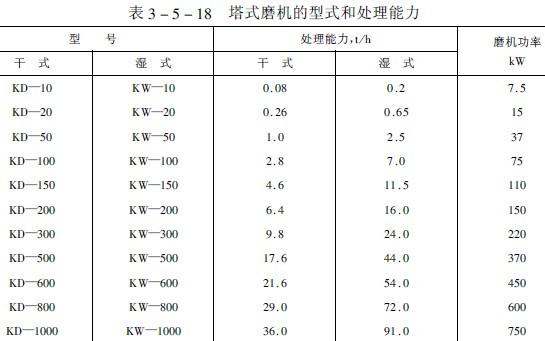 表3-5-18列出了日本生產(chǎn)的塔式磨機(jī)的系列產(chǎn)品,并列出了該系列產(chǎn)品處理給料粒度小于3毫米,產(chǎn)品粒度平均10微米的處理量(噸/時(shí))。