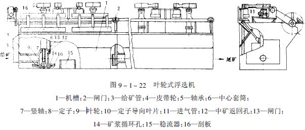 圖9-1-22為葉輪式浮選機的結構圖。葉輪式浮選機是由一排木制的或金屬制的長方形槽子所組成。其間用隔板分成幾個浮選槽,再由2個、4個或6個浮選槽組成一個機組,每臺浮選機由幾個機組組成。每個機組的第一個槽是吸入槽(帶有給礦管3),其下部是和第二個槽(無給礦管)相通的。每個槽內有豎軸7,其下端裝有葉輪9,上端裝有皮帶輪4。葉輪由電動機經三角皮帶帶動旋轉。由于葉輪的旋轉,在葉輪上面的定子. 下形成負壓,致使空氣由進氣管11進入,并形成氣泡。吸入的空氣和由給礦管進入的礦漿在葉輪上部混合,并被旋轉的葉輪拋向槽體周圍。為了防止礦漿產生渦流,在槽體內裝有穩流器15———直立翅板。欲浮礦物被氣泡帶至礦漿表面形成礦化泡沫層,用旋轉的刮板16將泡沫刮出即得精礦;不浮的礦物和脈石則經槽子側壁上的閘門2進入下一浮選槽內。每個機組中的礦漿水平可用閘門2來調節。在豎軸外有和進氣管相連的中心套筒6。為了控制吸氣量,在中心套筒的下部開有較大的循環孔12,用閘門13進行控制,同時還在定子蓋板上布置了許多小孔14來改變礦漿的內循環。