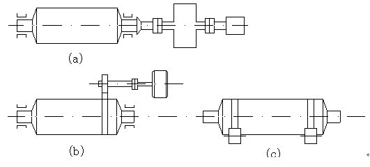 1、中心傳動(dòng)。由卸料端經(jīng)空心軸直接與減速機(jī)出軸聯(lián)接,由電動(dòng)機(jī)帶動(dòng),傳動(dòng)軸的中心與簡(jiǎn)體中心線一致(圖2中a)。